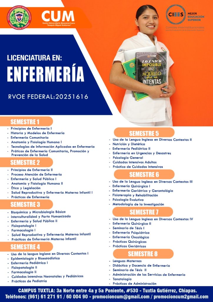 comienza tu camino al exito CARRERA TÉCNICA/LICENCIATURA Licenciatura en EnfermeríaINSCRIPCIONES ABIERTAS 2025¡QUIERO INSCRIBIRME! CONVOCATORIA LENF Descarga PLAN DE ESTUDIOS LENFDescarga Carrera Técnica en Radiología e ImagenINSCRIPCIONES ABIERTAS 2025¡QUIERO INSCRIBIRME! CONVOCATORIA TRIDescarga PLAN DE ESTUDIOS RADIOOGIA E IMAGENDescarga POSGRADOS Especialidad en Enfermería QuirúrgicaINSCRIPCIONES ABIERTAS 2025¡QUIERO INSCRIBIRME! CONVOCATORIA EEQ Descarga PLAN DE ESTUDIOS EEQDescarga Especialidad en Enfermería en Terapia IntensivaINSCRIPCIONES ABIERTAS 2025¡QUIERO INSCRIBIRME! CONVOCATORIA ETIDescarga PLAN DE ESTUDIOS ETIDescarga Maestría en Administración en Sistemas de la SaludINSCRIPCIONES ABIERTAS 2025¡QUIERO INSCRIBIRME! CONVOCATORIA MASSDescarga PLAN DE ESTUDIOS MASSDescarga Maestría en Ciencias de la EducaciónINSCRIPCIONES ABIERTAS 2025 ¡QUIERO INSCRIBIRME! CONVOCATORIA MCE Descarga PLAN DE ESTUDIOS MCEDescarga Download QR 🡻